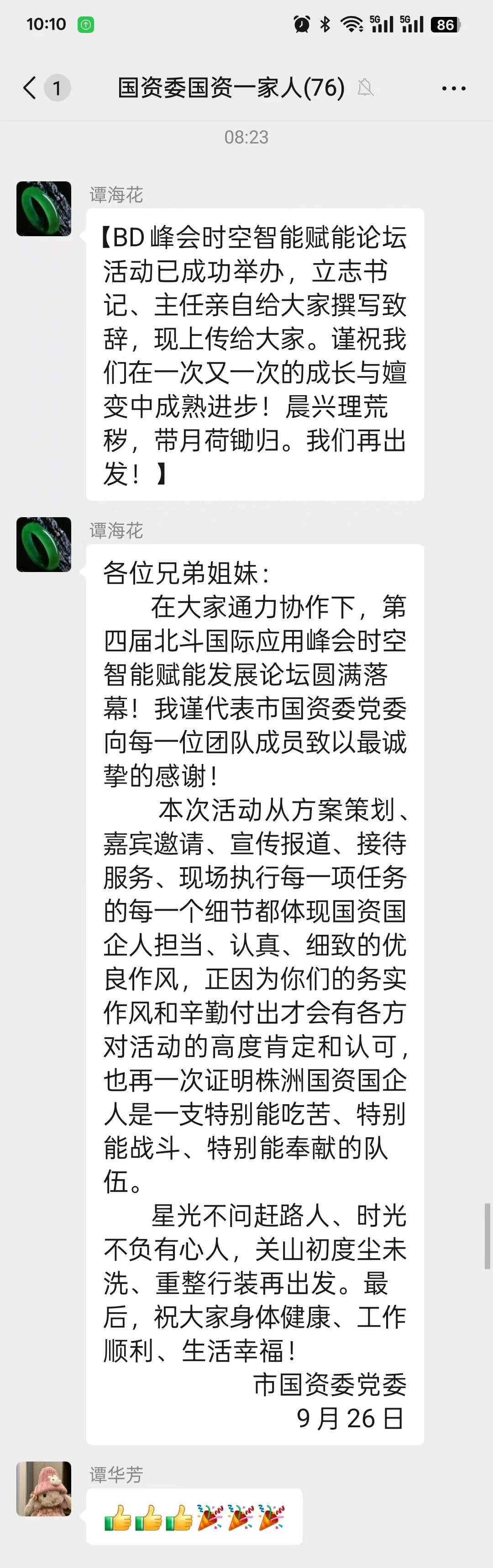 9月26日一上班,市国资委全体工作人员在微信工作群里收到由办公室负责人转发的一条特别的微信消息,消息内容主要是市国资委党委对第四届北斗规模应用国际峰会——时空智能赋能发展论坛工作团队的感谢和鼓励,由党委书记、主任肖立志亲自撰拟。