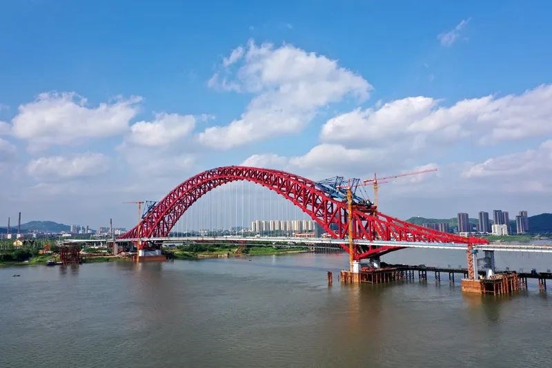 同样是在清水塘,红色的清水塘大桥已经飞架江面。大桥主体结构早已完工,大桥已经基本成型,如今正在进行护栏、沥青铺筑等桥面施工。施工方介绍,将力争在6月30日举行试通车。