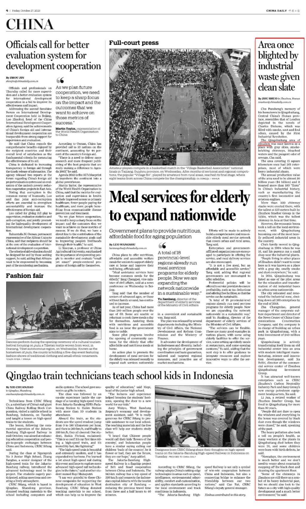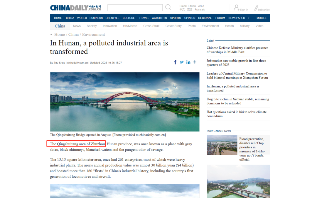 10月26-27日,《中国日报》(ChinaDaily)以《In Hunan, a polluted industrial area is transformed》和《Area once blighted by industrial waste given clean slate》为题,对清水塘工业发展史及搬迁改造、环境治理、新城建设、产业发展等新成果进行报道。人民日报内参部海外版、中国经济周刊、环球网等媒体纷纷转载。