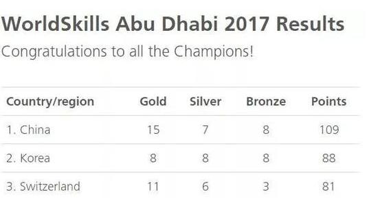 报道称,2013年的技能大赛上还看不到中国金牌的影子。2015年大赛上它仍然在瑞士之后排名第五位。但眼下,中国已经是世界冠军(15枚金牌、7枚银牌、8枚铜牌和12个优胜奖),而且几乎再也无法被打败了。