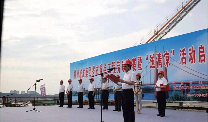 7月20日上午,市城发集团2016年度省、市重点工程劳动竞赛暨“送清凉”活动启动仪式在湘江六桥施工现场举行。市人大常委会副主任、市总工会主席王建之,副市长谭可敏、中交二航局副总经理吴迅、市政府副秘书长王事兴、集团总经理李柏坚、工会主席邓树松等出席启动仪式。集团公司员工代表、城发建设公司全体职工及劳动竞赛参赛单位约300人参加了活动的启动仪式。