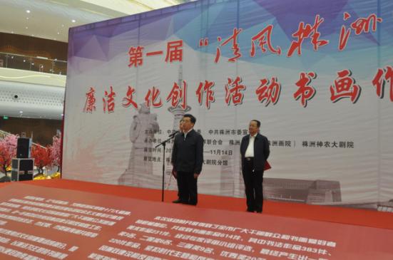 11月8日上午,第一届“清风株洲”廉洁文化创作活动书画作品展在株洲市神农大剧院开幕。株洲市委常委、市纪委书记赖馨正参加开幕式并宣布书画作品展开幕,市委常委、宣传部部长聂方红主持开幕式,市纪委副书记、市监察局局长、市预防腐败局局长朱胜辉致开幕辞。
