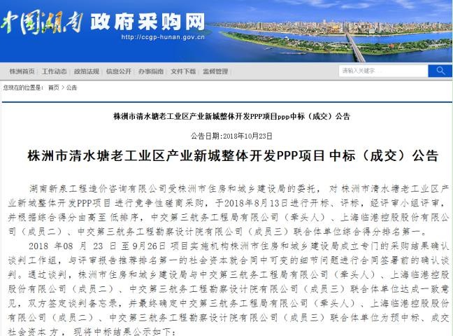在市住建局、市财政局、市法制办等相关部门的大力推进和积极协调下,株洲市清水塘老工业区产业新城整体开发PPP项目于2018年10月23日发布中标公告,最终确定中交第三航务工程局有限公司(牵头人)、上海临港控股股份有限公司(成员二)、中交第三航务工程勘察设计院有限公司(成员三)联合体单位为成交社会资本方。