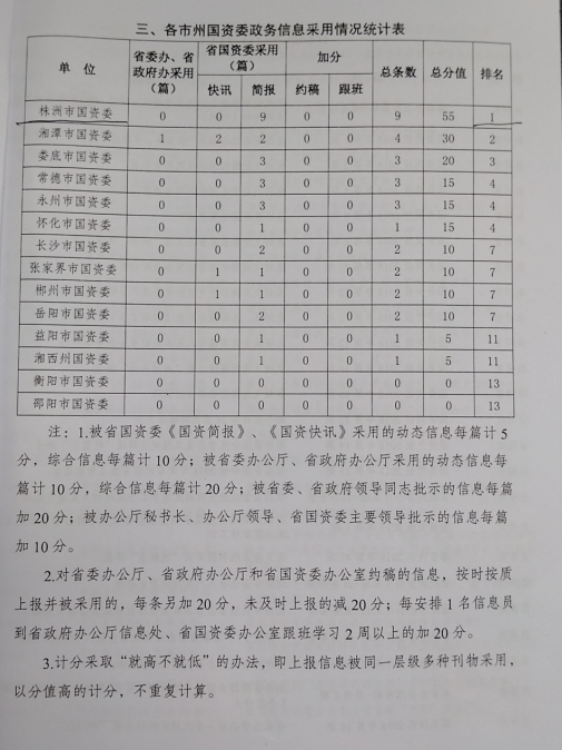 近期,湖南省人民政府国有资产监督管理委员会对全省国资系统2018年政务信息采用情况进行通报,株洲市国资委以总条数、总分值在全省市州国资委排名第一,其中总条数占全省市州国资委被采用政务信息总条数的27.3%。