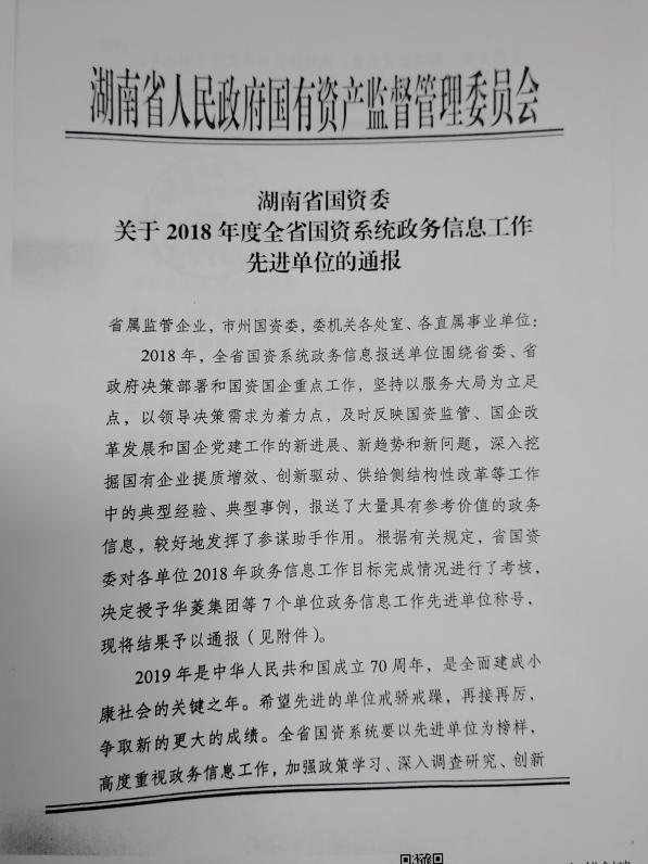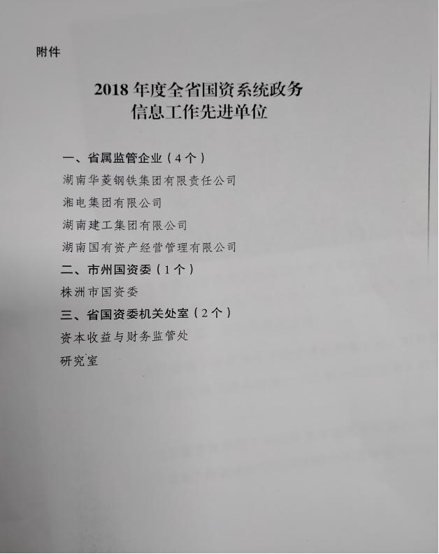 近日,湖南省国资委对2018年度全省国资系统政务信息工作先进单位进行通报,市国资委荣膺7个政务信息工作先进单位之列,是全省14个市州国资委中唯一获此殊荣的市州国资委。