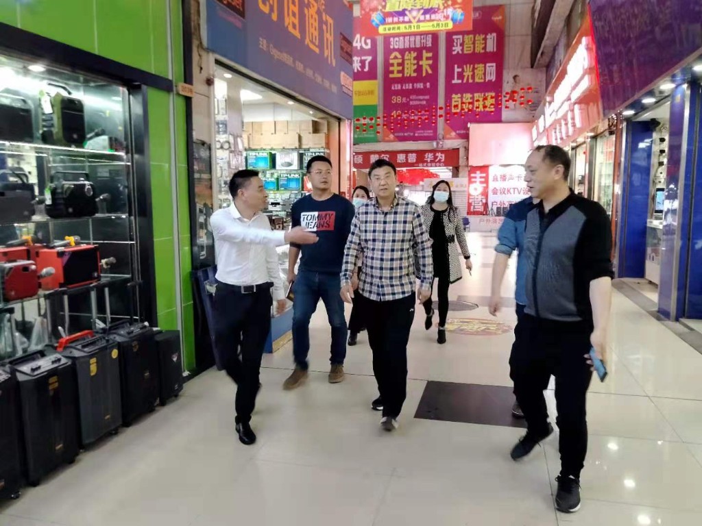 在江南商城,欧阳光对电器经营楼面、窗帘经营楼面进行环场巡视,察看了其配电室、消防控制室设施及周边经营环境,并听取相关安全工作情况介绍。
