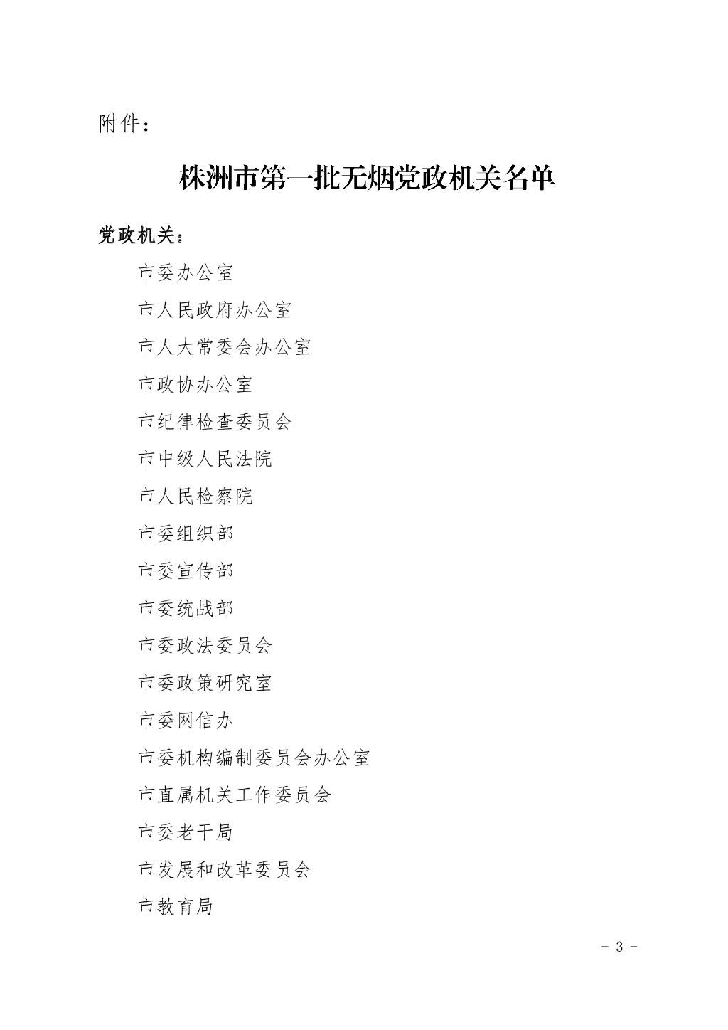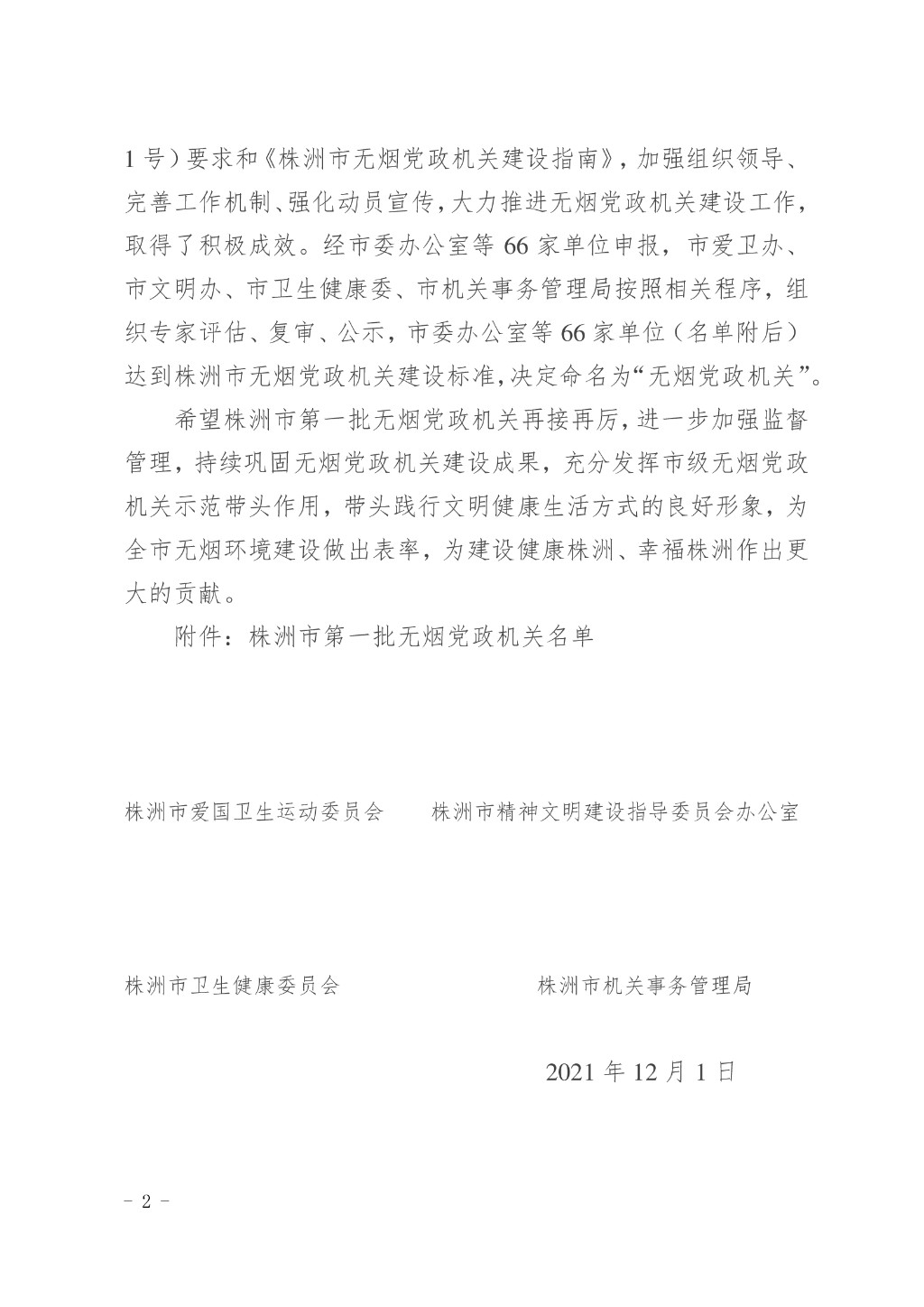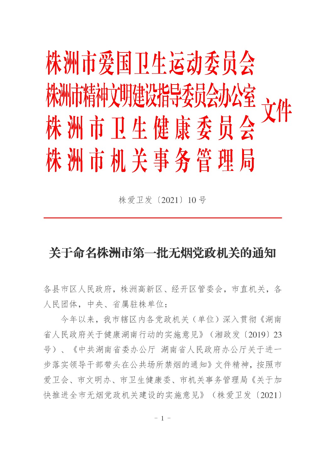 近日,市爱卫办、市文明办、市卫生健康委、市机关事务管理局联合下文《关于命名株洲市第一批无烟党政机关的通知》(株爱卫发〔2021〕10号),对按照相关程序,组织专家评估、复审、公示,达到株洲市无烟党政机关建设标准的66家单位,命名为“无烟党政机关”。市国资委荣登株洲市第一批无烟党政机关榜单。