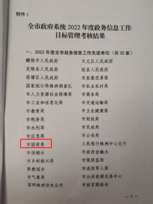 日前,株洲市政府办下发全市政府系统2022年度政务信息工作目标管理考核结果的通报,根据政务信息工作考核有关规定和过去一年政务信息采用情况,对全市32家政务信息工作先进单位予以通报表扬。市国资委获评2022年度全市政务信息工作先进单位。