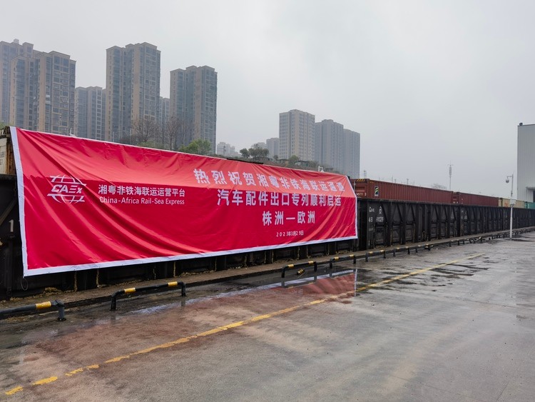 3月29日上午,一列满载汽车配件的火车从株洲中车物流驶出,将通过铁路抵达广州南沙港,再通过海运方式运至欧洲,开启湘粤非铁海联运 “株洲-欧洲”汽配专列。