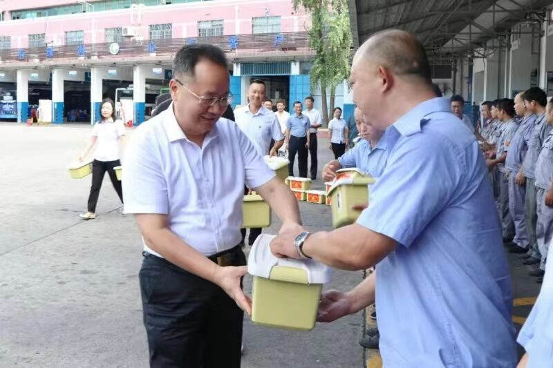 聂方红一行到公交河西基地,与坚守一线的工作人员亲切交谈,询问他们在炎炎夏日里的工作强度及健康状况,感谢他们辛勤坚守岗位,并嘱咐大家劳逸结合,做好个人安全防护。