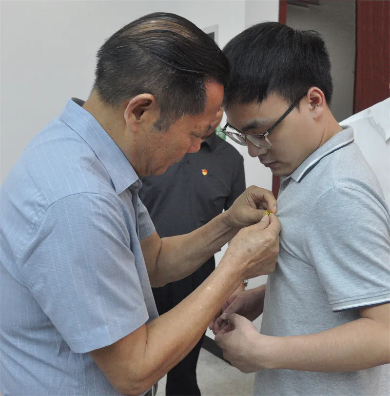 会上,机关退休支部党员代表为新党员佩戴了党员徽章,更加坚定党员干部永远跟党走的信念,体现了传承红色基因,赓续红色血脉。