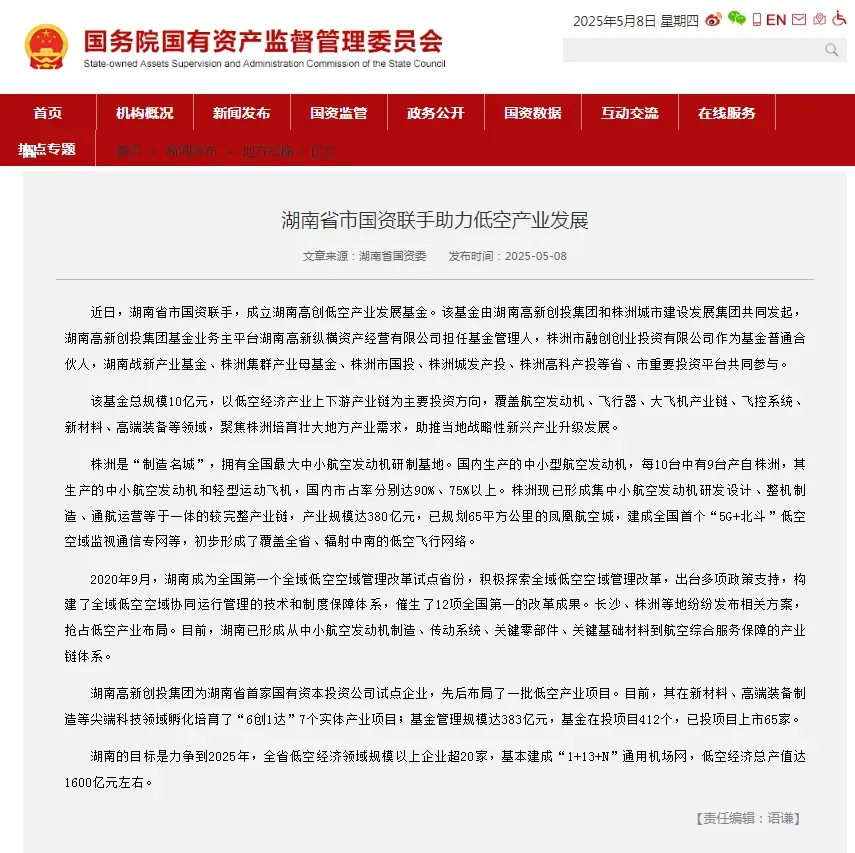 5月8日,国务院国资委网站刊发文章《湖南省市国资联手助力低空产业发展》,报道由湖南高新创投集团和株洲城市建设发展集团共同发起,成立湖南高创低空产业发展基金。(市城发集团)