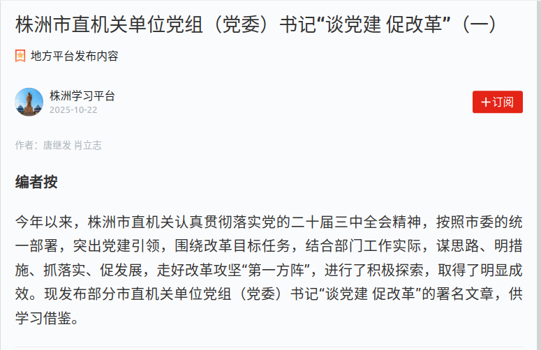 10月22日,“学习强国”株洲学习平台发布《株洲市直机关单位党组(党委)书记“谈党建 促改革”(一)》,市国资委党委书记、主任肖立志署名文章获得推荐。