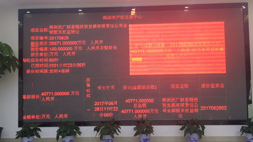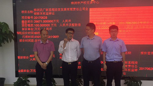 6月28日上午10时,集团下属武广公司旗下子公司株洲武广新里程投资发展有限责任公司(以下简称武广新里程公司)全部股东权益于株洲市产权交易中心正式开始竞拍,底价26671万元,最终成交价40771万元,溢价达1.41亿,用时1小时23分06秒,竞拍138轮,最终由株洲中天恒基房地产有限公司竞得,并同时取得武广新里程公司名下33区3#地块、13#地块剩余部分地块的开发权。