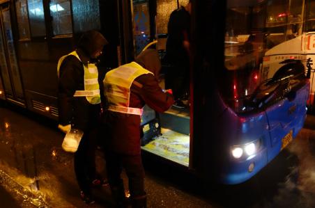 公交巴士、发展公司的管理人员在各重要路段和区域巡查,督导驾驶员冰雪天谨慎行车。