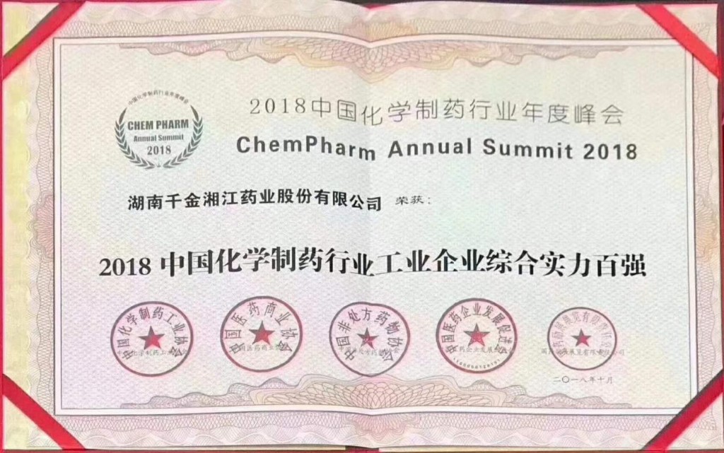 10月16日,“2018年中国化学制药行业年度峰会”在南京召开,会上公布了“2018年中国化学制药行业工业企业综合实力百强”名单,千金集团旗下子公司千金湘江药业再次上榜,位列第85名。
