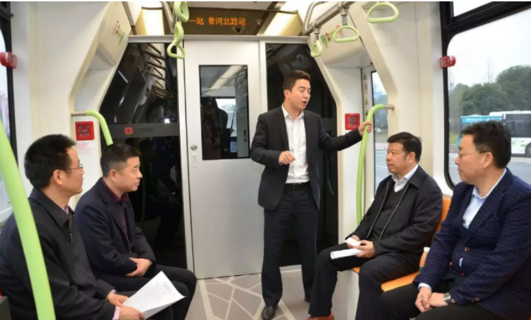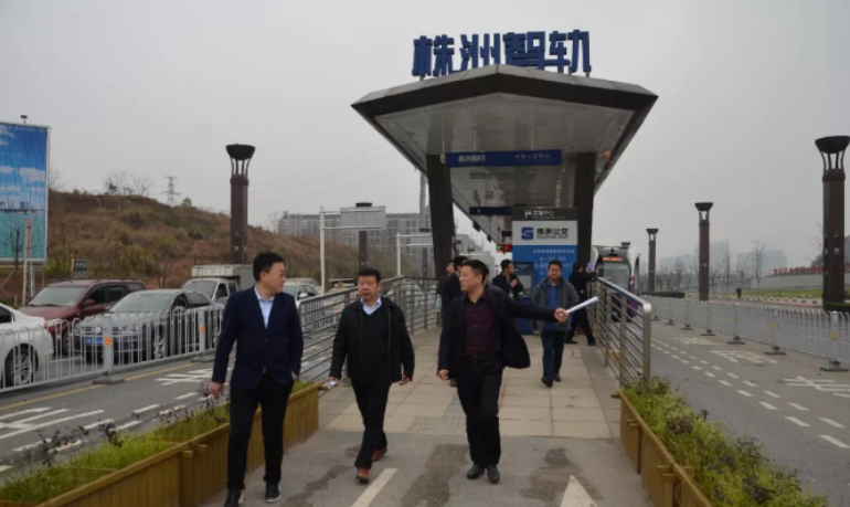 神农城北ART站,省厅督导组一行受到了在此等候的株洲市交通运输局党组副书记、副局长徐业伟,株洲公交总公司党委书记、董事长肖长江等人的热情接待。督导组一行饶有兴致的登上智轨,干净明亮的视窗,整洁舒适的车厢,平稳的运行乘车体验,都令领导们赞不绝口。肖董事长在车上向督导组简单的介绍了我市新能源公交车辆的推广和应用、ART智轨建设和营运的相关情况。