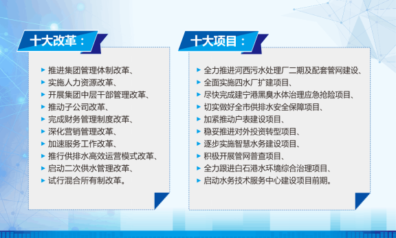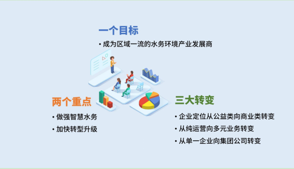 “建成区域一流的水务环境产业发展商”、“建设智慧水务、加快转型升级”,布局水务运营、水务工程、水环境治理、水务投融资等四大业务板块,实现“公益类向商业类、纯运营向多元业务、单一企业向集团公司”三大转变,实现“总资产50亿元,净资产30亿元,年营业收入10亿元,年净利润1亿元,积极对接资本市场”的“5311”发展目标等等,无一不令人感到精神振奋、干劲十足。
