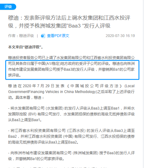 7月30日,穆迪(Moody’s)投资服务公司发布公告,上调株洲城发集团主体信用评级为投资级Baa3,评级展望为稳定。