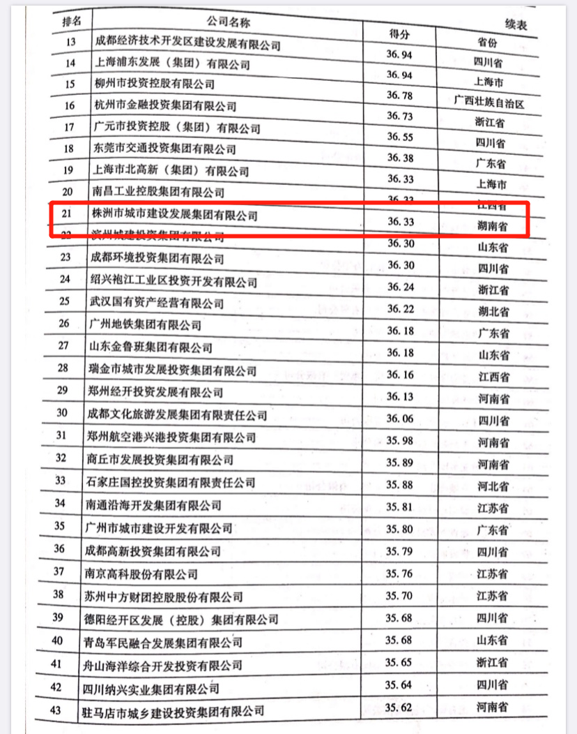 株洲城发集团在全国地级市转型发展综合排名第21位!