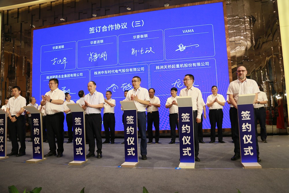 现场,市天桥起重与华菱湘钢、华菱涟钢、华菱衡钢、VAMA、中车时代电气、株硬集团签订合作协议。