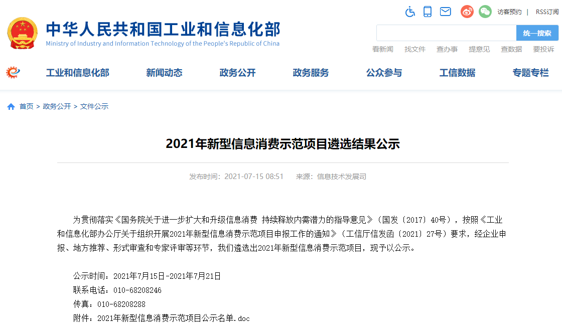 今年以来,工业和信息化部为贯彻落实《国务院关于进一步扩大和升级信息消费 持续释放内需潜力的指导意见》(国发〔2017〕40号),启动了2021年新型信息消费示范项目申报工作,通过企业申报、地方推荐、形式审查和专家评审等系列程序最终确定入选项目名单。此次评选旨在总结推广可复制的经验做法,进一步释放信息消费潜力,推动信息消费扩大和升级。