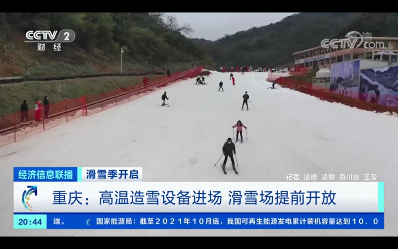 北京冬奥会临近,11月22日晚20:44,央视2套财经频道以《重庆:高温造雪设备进场,滑雪场提前开放》为题播出特别报道,展示了重庆金佛山北坡滑雪场,市民享受滑雪运动乐趣的情景。报道特别指出,该滑雪场因使用高温造雪机,让重庆市民较往年提前一个月感受冰雪季,现场受访市民纷纷点赞。