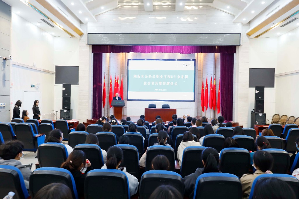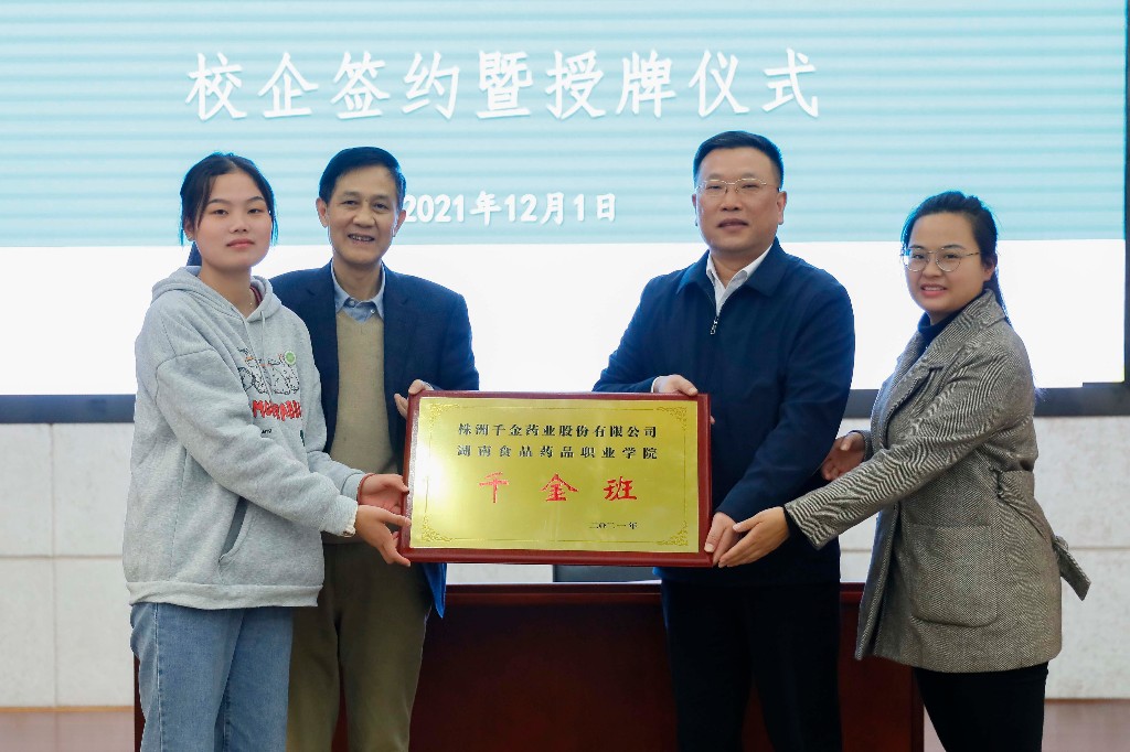 12月1日,市千金集团与湖南食品药品职业学院举行校企合作签约暨授牌仪式。千金集团党委书记、董事长江端预与湖南食品药品职业学院党委书记杨文伟代表双方签订举办“千金班”协议,并为“千金班”授牌。