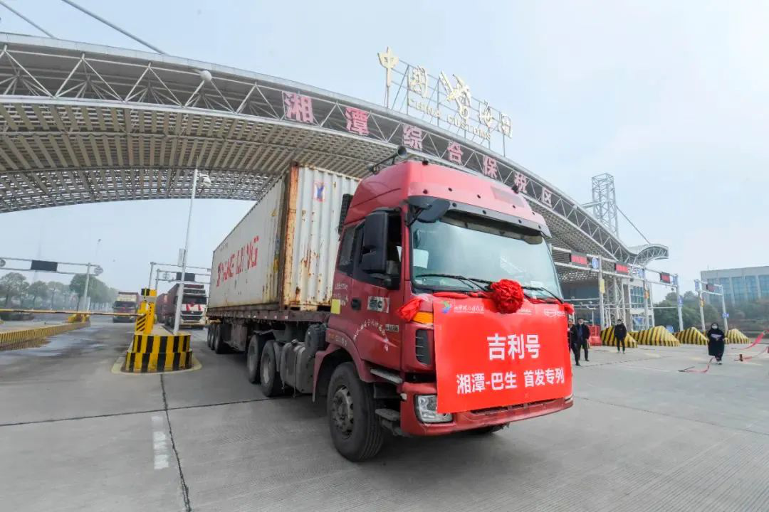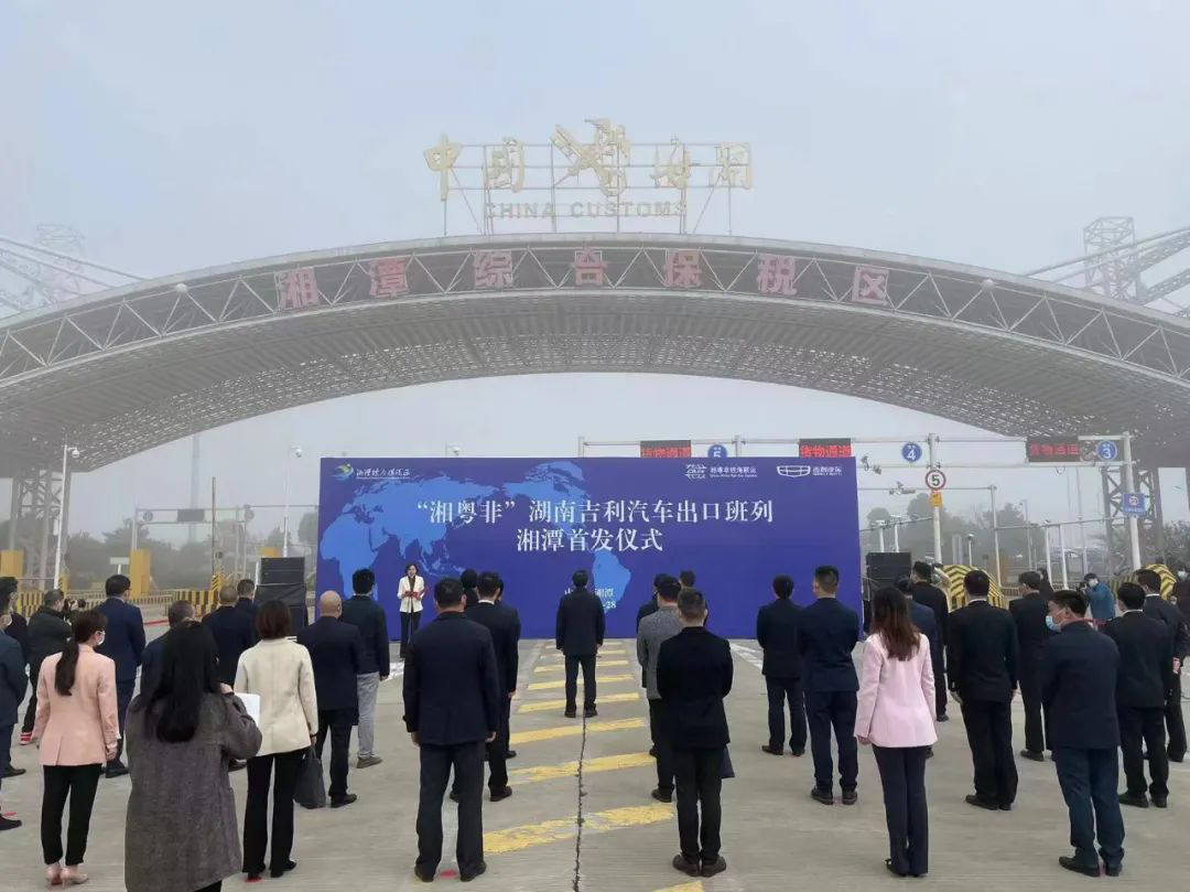 “湘粤非”湖南吉利汽车出口班列在湘潭综保区正式发运。