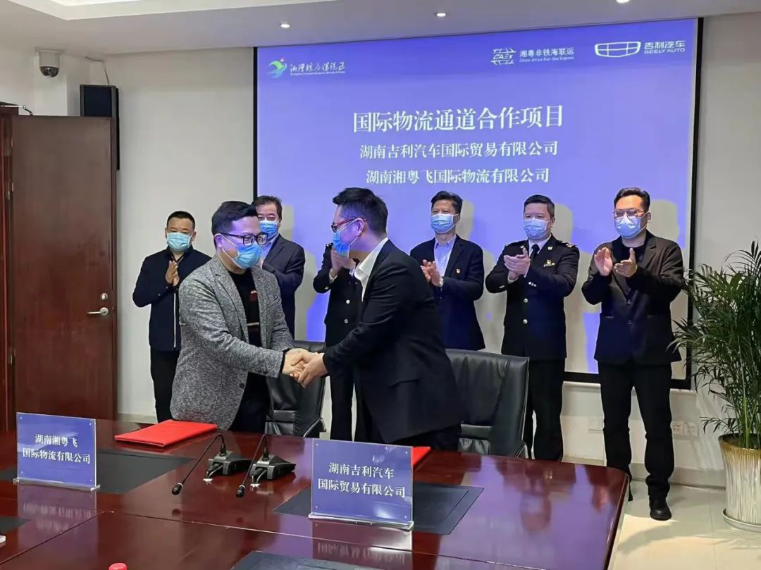 仪式后,湘粤飞国际物流有限公司与湘潭综合保税区、湖南吉利汽车国际贸易有限公司互签战略合作协议。随后,湘粤非铁海联运运营平台湘潭办事处在湘潭综保区揭牌。