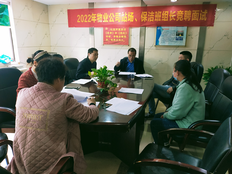 为了更好地开展班组建设工作,抓好基础管理,全面提升员工综合素质,加快企业创新发展,更好地发挥优秀班组的骨干和带头作用,4月1日上午,市公交物业公司开展站场、保洁班组长公开竞聘面试会,公司经理罗峰斌、副经理周宇、高知参加会议。