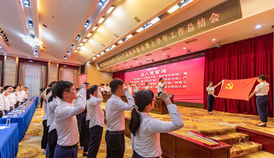大会在庄严的国歌声中拉开帷幕,全体与会人员庄严肃立,齐唱国歌。20名新党员面对党旗,高举右臂、紧握右拳,全体党员一同重温入党誓词。
