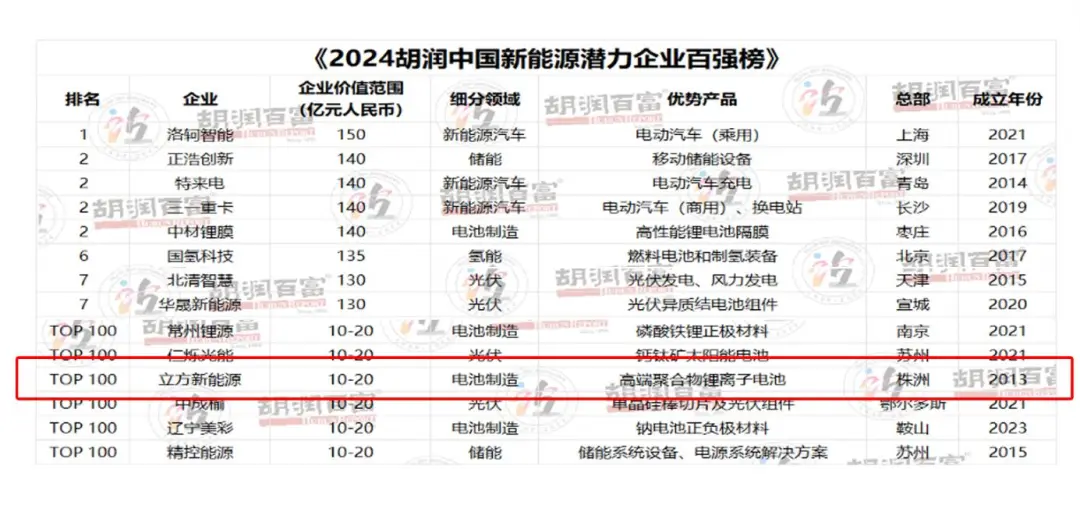 近日,胡润研究院发布了“2024胡润中国新能源潜力企业百强榜”,市国投集团全资子公司株洲市国投创新创业投资有限公司投资的湖南立方新能源科技有限责任公司(以下简称“立方新能源”)成功入选,是株洲唯一上榜的企业。