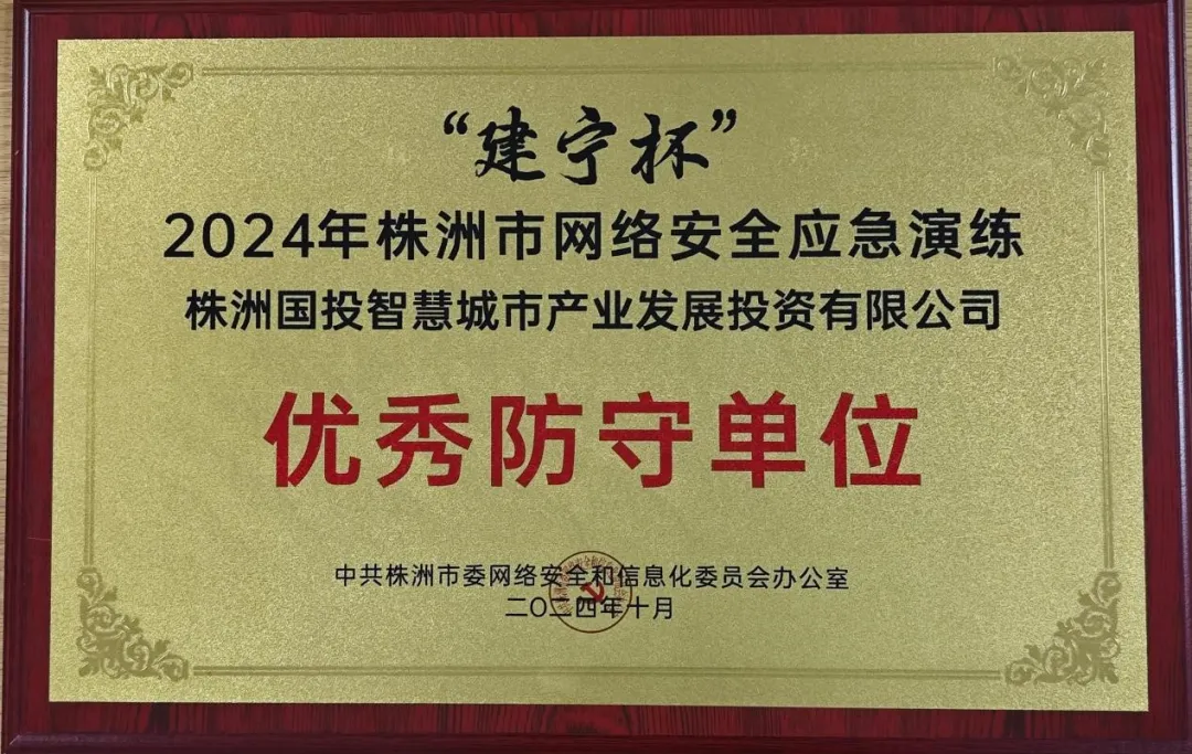 国投智城公司荣获“2024年株洲‘建宁杯’网络安全攻防演练优秀防守单位“称号