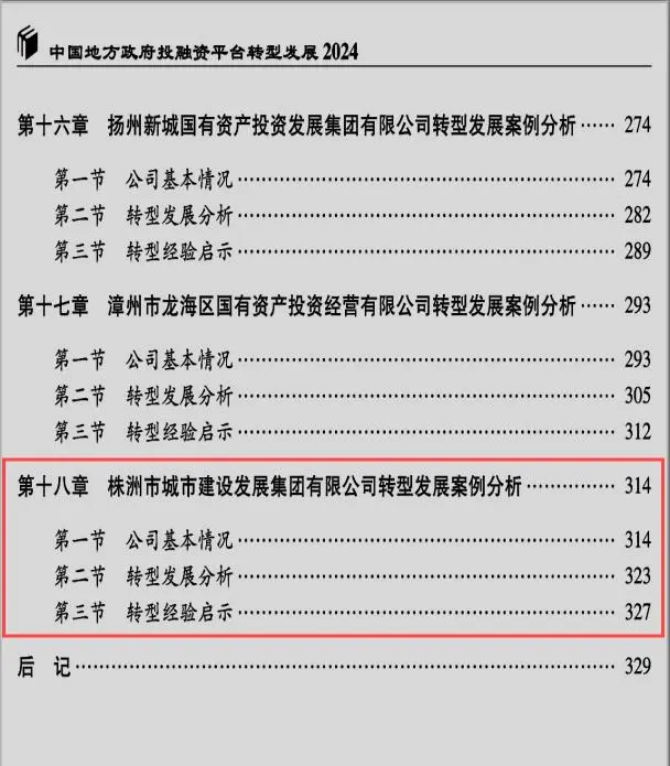 近日,由经济管理出版社编辑出版的《中国地方政府投融资平台转型发展研究》一书,在“第八届雄安新区投融资发展论坛”上正式发布,《株洲市城市建设发展集团有限公司转型发展案例分析》成功入选全国转型发展案例。该书从公司基本情况、转型发展分析和转型经验启示三个章节对集团进行相关分析介绍。