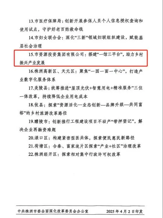 近日,中共株洲市委全面深化改革委员会公布了2024年度改革优秀案例评选结果,市资源集团乡村公司凭借《搭建“一馆三平台”,助力乡村产业振兴》成功入选提名案例,成为全市乡村振兴领域的改革典范。