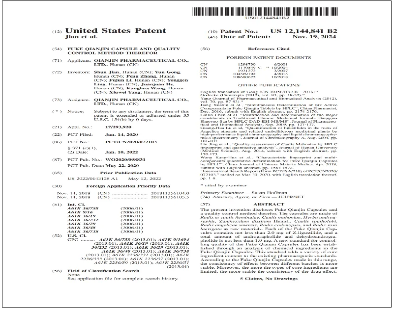 近日,千金药业收到美国专利商标局文件,其产学研合作研发技术“妇科千金胶囊及其质量控制方法”发明专利通过PCT途径获得美国专利权。在千金药业历史上,这是继妇科千金片(胶囊)基础研究成果之后获得的第二件海外发明专利,为千金药业产品出海及海外知识产权保护奠定了坚实的基础。