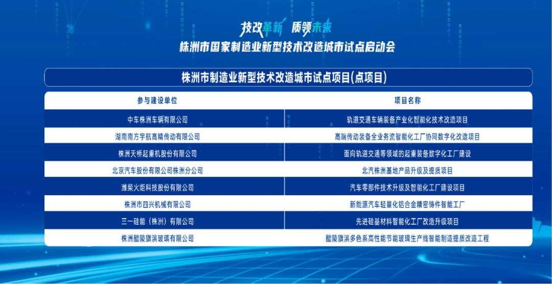 今年5月,株洲入选第二批国家制造业新型技术改造试点城市,成为继长沙之后湖南第二个试点城市。此次试点主要是为了加快数字技术、绿色技术以及创新产品的推广应用,推动制造业高端化、智能化、绿色化发展。