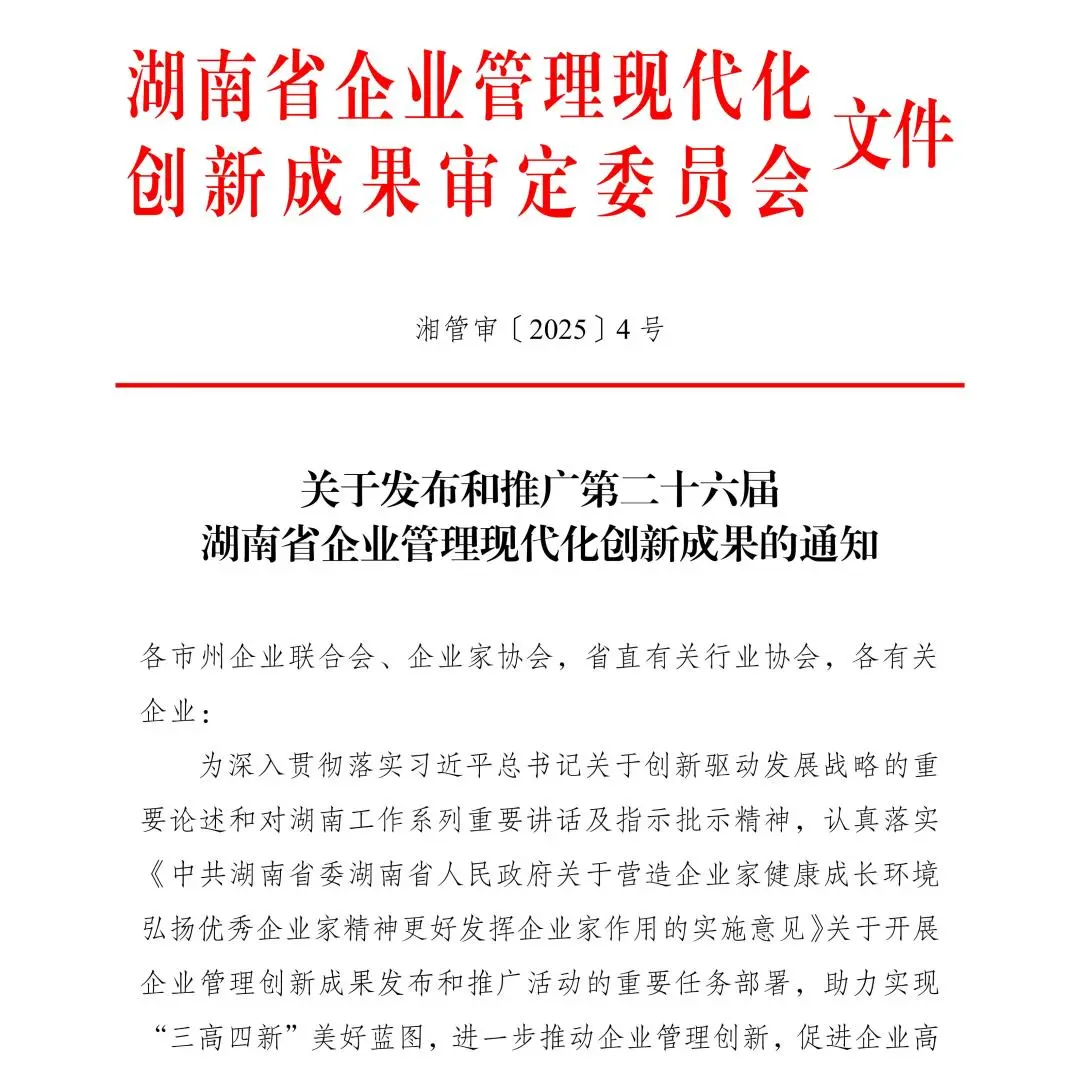 湖南省企业管理现代化创新成果是在湖南省工业和信息化厅、省国资委指导下,由湖南省企业管理现代化创新成果审定委员会组织评审的省级管理类成果。该项成果作为全省企业管理创新的重要标杆与展示窗口,集中体现了企业在现代化管理理念、理论与方法方面的系统实践与提炼,形成一批可借鉴、可推广的创新管理成果,展现企业在管理实践中的突出成就。