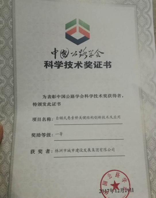 2018年6月19日,由中国科学技术协会、交通运输部,中国工程院共同主办的“2018世界交通运输大会”上,由株洲城发集团打造的枫溪大桥—“自锚式悬索桥关键结构创新技术及应用”荣获“中国公路学会科学技术奖”一等奖。