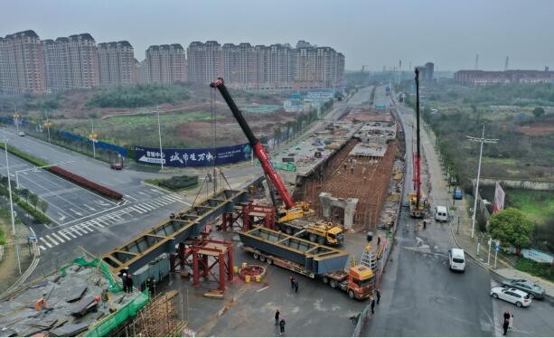洞株路快速路吊装首片钢箱梁,复工复产走上“快车道”