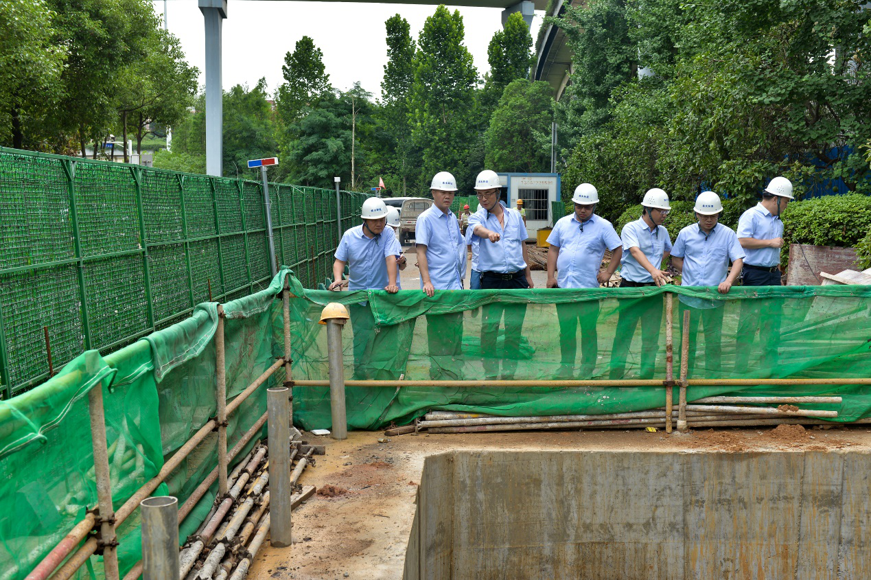 在项目建设现场,谢锦辉实地调研白石港水质净化中心二期、调蓄池、内源治理、控源截污等子项目建设进展,认真了解各子项目人、材、机部署及现场安全文明施工情况。