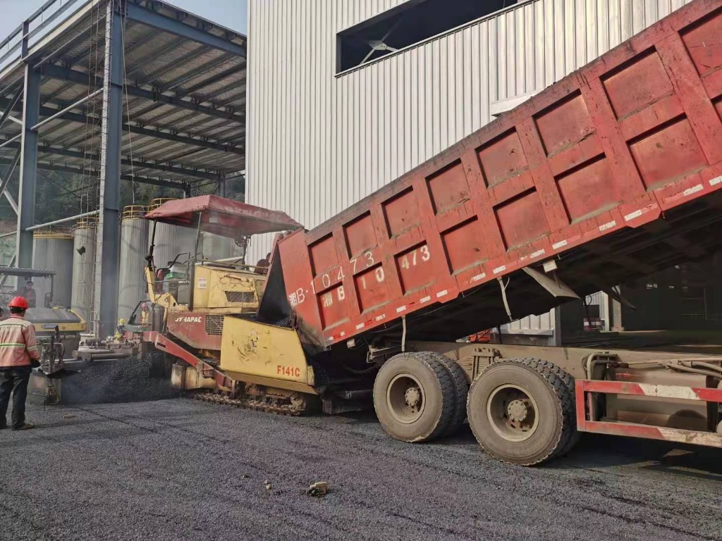 (使用自产第一锅沥青混合料摊铺基地项目内道路)