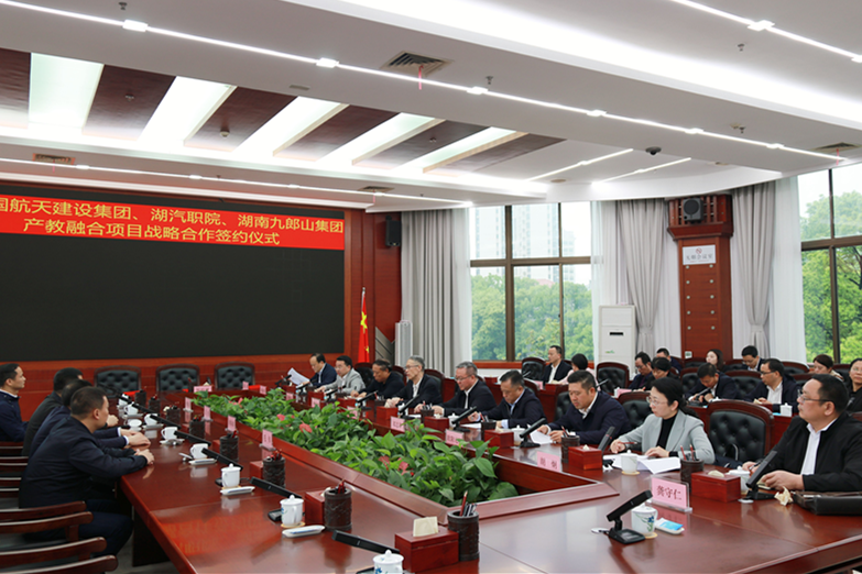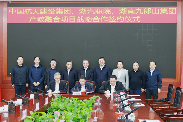 湖南汽车工程职业学院院长尹万建,中国航天建设集团湖南公司总经理周环球,株洲国投集团党委委员、副总经理,九郎山集团党委书记、董事长龚守仁分别代表三方签约。
