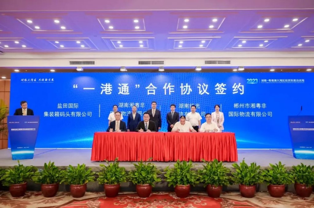 会上,湖南湘粤非国际物流有限公司与广州港、盐田港签署“湘粤一港通”合作协议,进一步提高通关效率,降低企业物流成本。