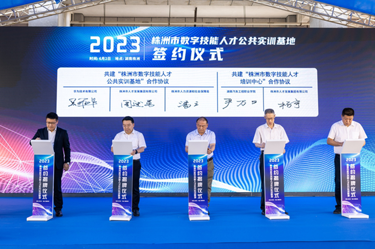 华为湖南政企总经理吴振华,市人社局党组书记、局长潘庆,集团党委书记、董事长周述勇分别代表三方签订“株洲市数字技能人才公共实训基地”合作协议。湖南汽车工程职业学院党委副书记、院长尹万建,集团党委副书记、工会主席杨宇分别代表双方签订“株洲市数字技能人才培训中心”合作协议。(市国投集团)