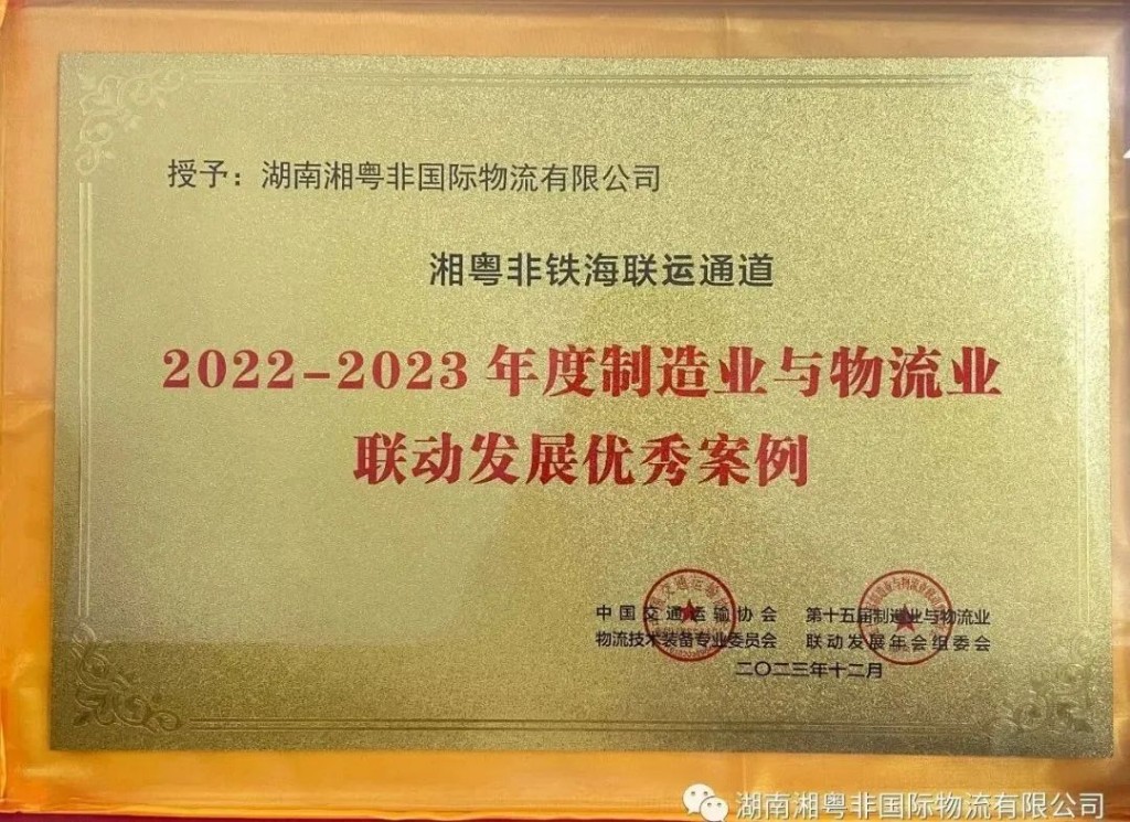 年会期间,公示了“2022-2023年度制造业与物流业联动发展创新成果及优秀案例”入选企业及名单。湖南湘粤非国际物流有限公司凭借“湘粤非铁海联运”项目成功入选优秀案例。