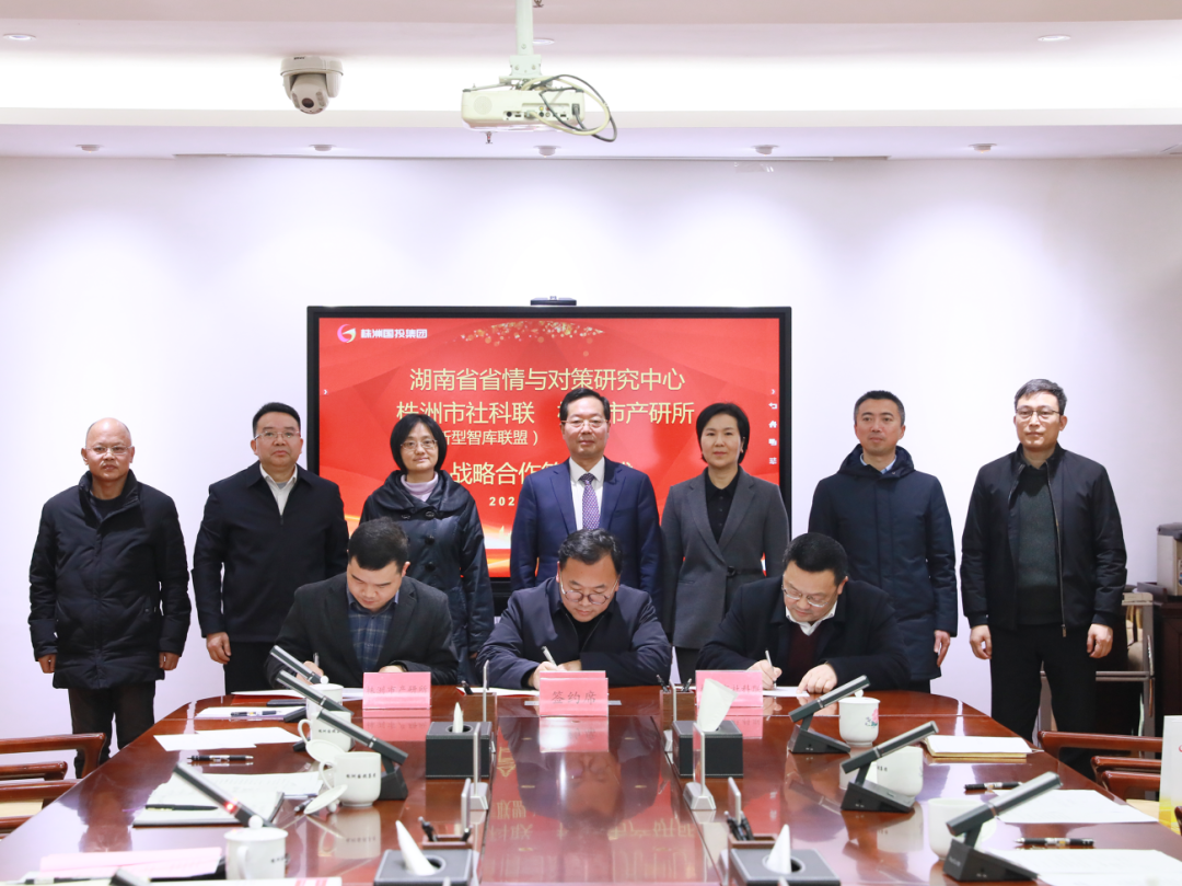 省社科联党组成员、副主席雷炘,科研组织处处长李邦铭,副研究员曾梦芳,株洲国投集团党委书记、董事长周述勇,党委副书记、总经理许大为,株洲市社科联党组成员、副主席张秋华出席签约仪式。