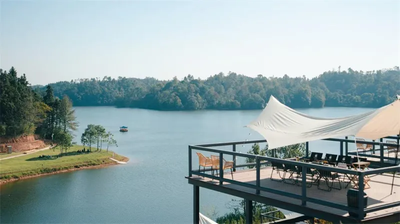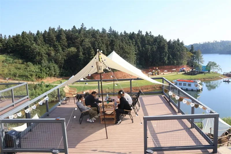 走进营地,藏宝小森林的神秘、羊圈咖啡的雅致以及乐源会客厅的舒适惬意,构成了一幅动人的画卷。一顶顶精致的露营帐篷点缀其间,仿佛将秋天的浪漫与温馨凝聚于此。游客还可乘舟游湖,欣赏碧水澄澈、浮光跃金的湖光山色,尽情感受大京风景区的自然之美。