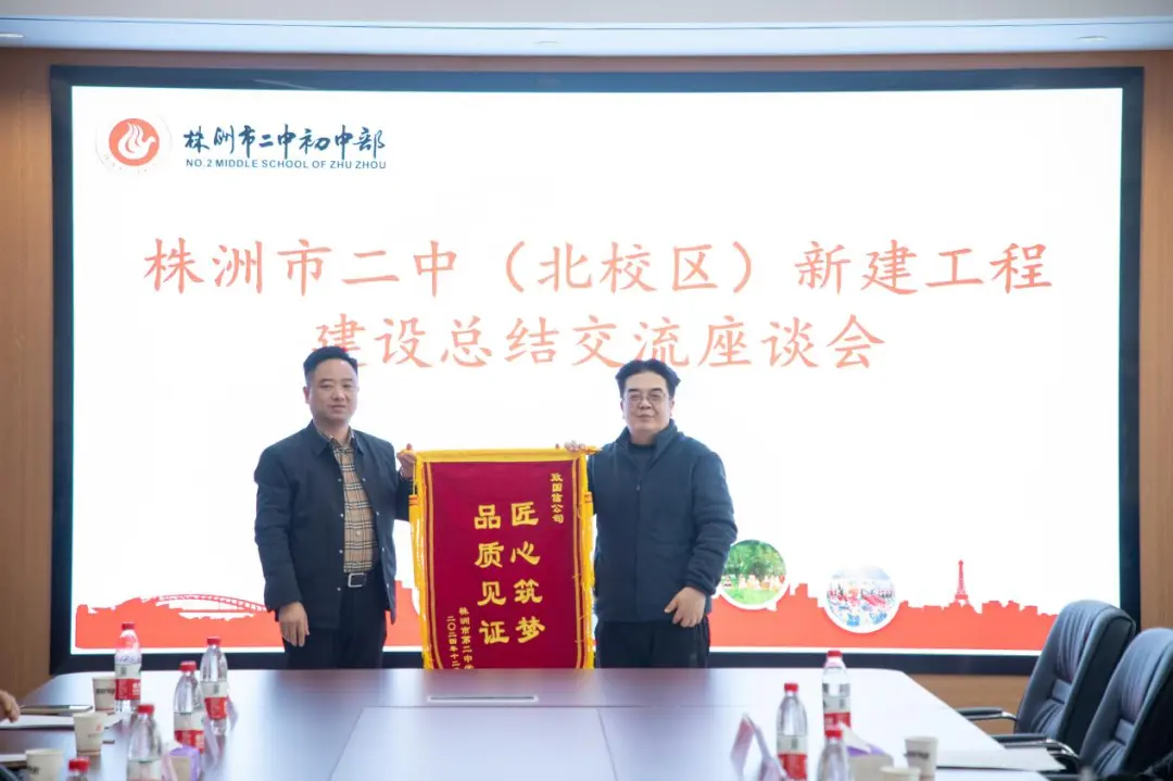 近日,株洲市二中(北校区)项目建设交流座谈会上,市二中党委副书记、校长陈捍东将一面印有“品质见证 匠心筑梦”的锦旗,郑重递向湖南国信建设集团。陈捍东表示,国信建设集团“城建铁军、品质行远”的企业精神在项目中展现得淋漓尽致,用实际行动诠释了高品质履约的深刻内涵,为秋季如期开学保驾护航,其专业与担当赢得了校方的高度赞誉。